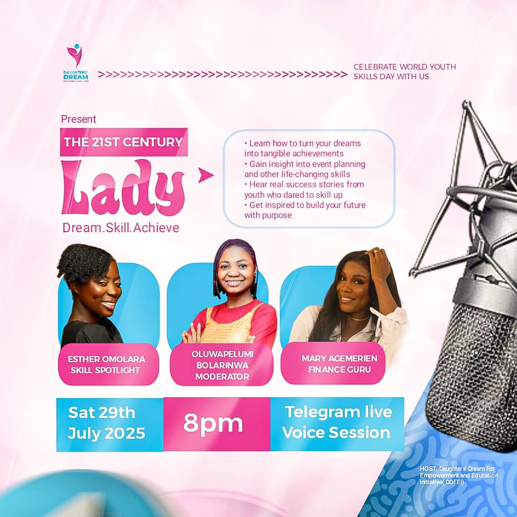 On Tuesday the 29th of July 2025 by 8pm prompt, to commemorate world youth skills day, daughters’ dream for empowerment and education initiative(DDEEI) will be holding a webinar for ladies in the 21st century. Empowering and educating them, starting from their minds which is the most vital tool in becoming. the webinar focuses on the aspect of a lady and her skills and finances. it holds LIVE ON TELEGRAM.